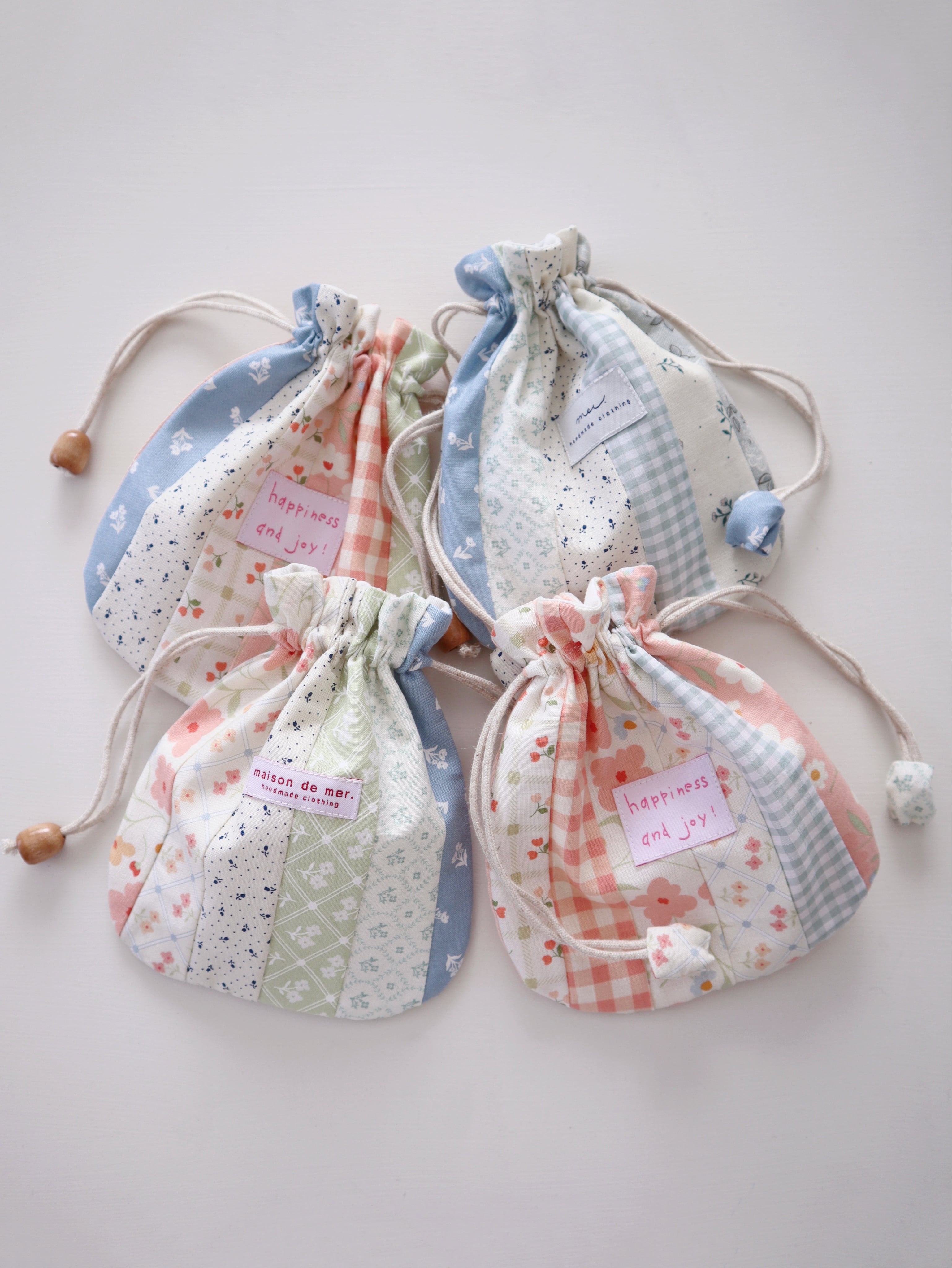 可愛い生地を沢山使ってパッチワーク巾着を作りました。