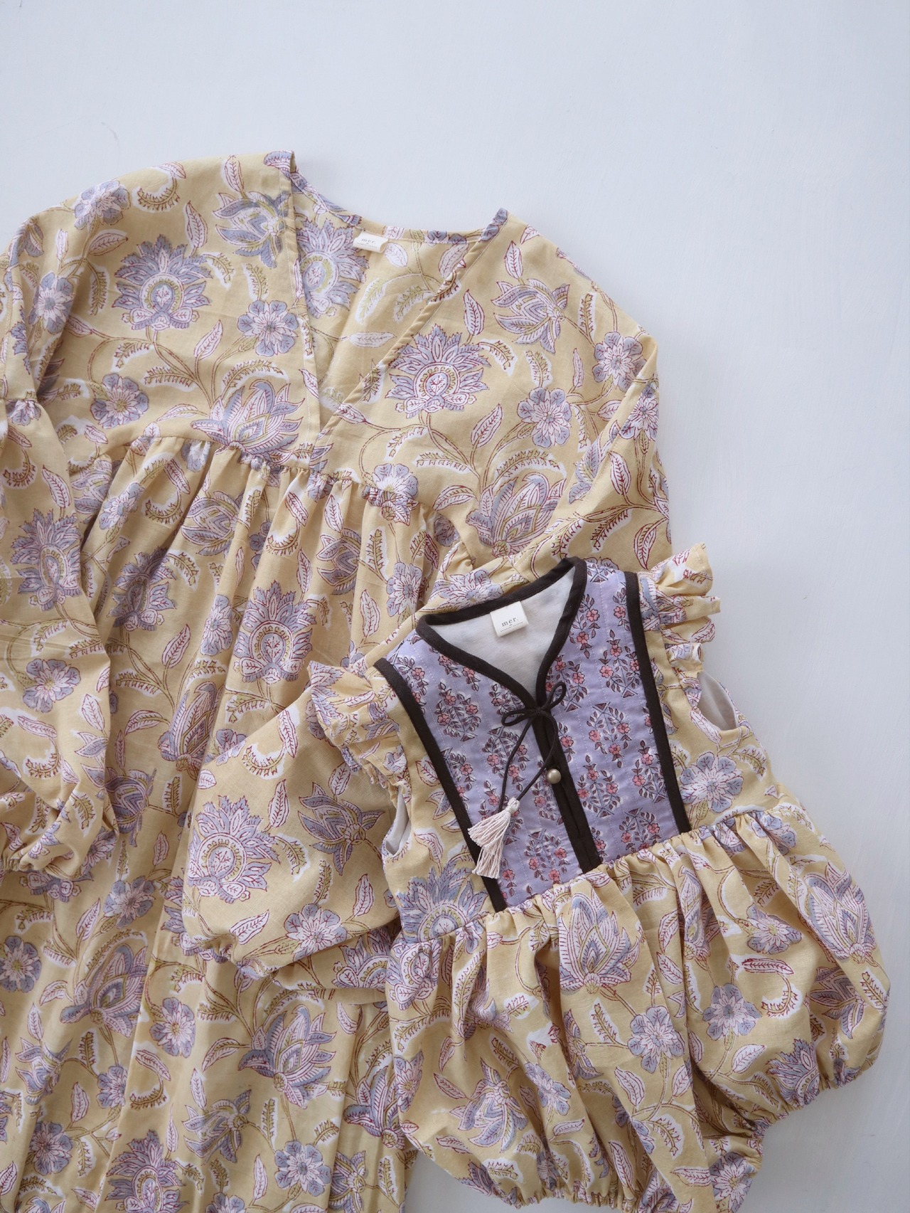 くすみイエローのインド綿で作ったベビーロンパースです。